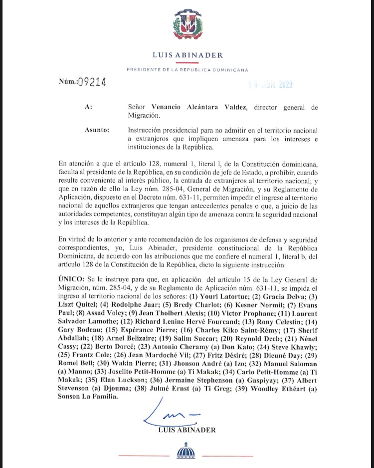 La medida dispone que las autoridades de migración, en aplicación del artículo 15 de la Ley General de Migración, núm. 285-04, y de su Reglamento de Aplicación núm. 631-11, han de impedir el ingreso al territorio nacional de los señores: Youri Latortue; Gracia Delva, Liszt Quitel, Rodolphe Jaar, Bredy Charlot, Kesner Normil, Evans Paul, Assad Volcy, Jean Tholbert Alexis, Victor Prophane, Laurent Salvador Lamothe, Richard Lenine Hervé Fourcand, Rony Celestin, Gary Bodeau, Espérance Pierre, Charles Kiko Saint-Rémy, Sherif Abdallah, Arnel Belizaire, Salim Succar, Reynold Deeb, Nénel Cassy, Berto Dorcé, Antonio Cheramy (a) Don Kato, Steve Khawly, Frantz Cole, Jean Mardoché Vil, Fritz Désiré, Dieuné Day, Romel Bell, Wakin Pierre, Jhonson André (a) Izo, Manuel Saloman (a) Manno, Joselito Petit-Homme (a) Ti Makak, Carlo Petit-Homme (a) Ti Makak, Elan Luckson, Jermaine Stephenson (a) Gaspiyay, Albert Stevenson (a) Djouma, Julmé Ernst (a) Ti Greg y Woodley Ethéart (a) Sonson La Familia.