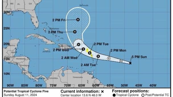 De acuerdo con los pronósticos del centro, de este ciclón se esperan lluvias hasta el viernes de una a dos pulgadas en las Islas de Barlovento y de dos a cuatro pulgadas en Sotavento y la República Dominicana.