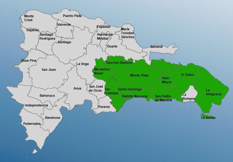 Asimismo, el COE, en su boletín meteorológico mantiene los niveles de alerta verde en San Cristóbal, San Pedro de Macorís, El Seibo, La Altagracia, Hato Mayor, Monseñor Nouel, Sánchez Ramírez, Monte Plata, Gran Santo Domingo y el Distrito Nacional.