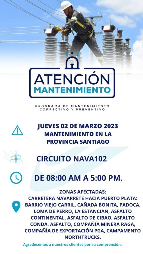 Puerto Plata. – Edenorte Dominicana S.A. informa que, para el jueves 02 de marzo del presente año 2023, técnicos de ETED estarán realizando trabajos de mantenimientos en la línea de transmisión 69 KV, Puerto Plata II – Plata Dorada, en horario de 12:00 a.m. a 4:00 p.m., por lo que el servicio se verá afectado para los usuarios de la misma.