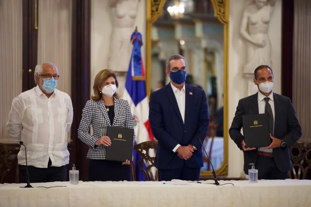 El acuerdo fue firmado por la vicepresidenta Raquel Peña, coordinadora del Gabinete de lucha contra el COVID-19, y Rafael Mendoza, presidente de AstraZeneca para Centroamérica y el Caribe, en el salón Las Cariátides del Palacio Nacional.
