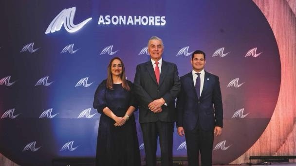 El presidente electo de Asonahores, Juan Bancalari, posa en el centro junto a la vicepresidenta Aguie Lendor y el presidente saliente, David Llibre. (Diario Libre/Félix León)