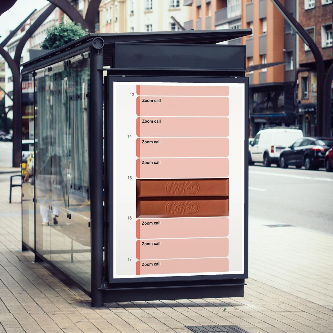 Probablemente lo hayas visto en Twitter, Instagram, LinkedIn o Facebook (o incluso en varias de estas redes sociales). Un anuncio en el que aparece la interfaz del calendario de un móvil y dos barritas de KitKat bloquean uno de los bloques de tiempo. Es sencillo, directo y encaja con el lema de la marca «Take a break». Tanto es así que se ha vuelto viral y mucha gente lo ha tomado por una pieza real de KitKat aunque se trate en realidad de un trabajo personal del creativo Sam Hennig.