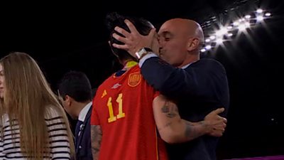 “Eh, no me ha gustado. (…) ¿Pero qué hago yo? ¡Mírame a mí, mírame!”, comentó Hermoso mientras se escuchaban risas y gritos de las compañeras al ver la imagen viral. Más tarde, el presidente de la RFEF entró al vestuario y en un directo emitido en el Instagram de Salma Paralluelo prometió a las ganadoras un viaje a Ibiza y pronunció la siguiente frase: “En Ibiza celebramos la boda de Jenni y Rubiales”.