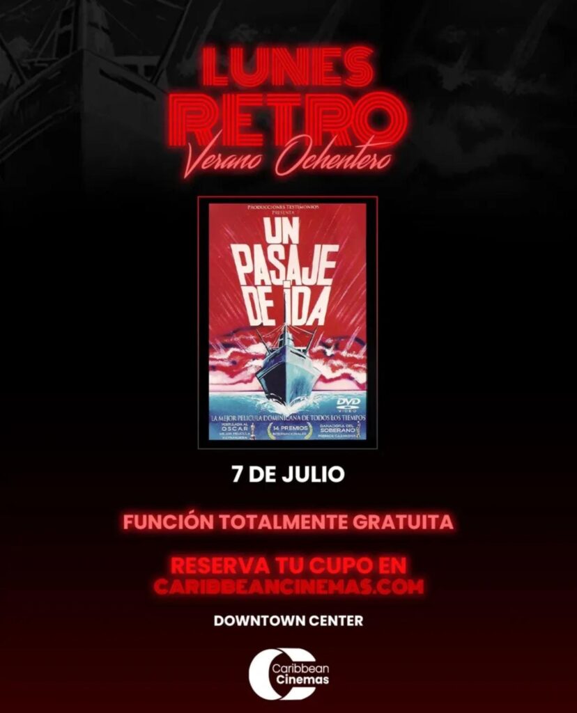 SANTO DOMINGO.– En homenaje a la memoria del cineasta dominicano Agliberto Meléndez, Caribbean Cinemas presentará de forma gratuita la icónica película Un pasaje de ida, este lunes 7 de julio a las 6:50 de la tarde, en su sala de Downtown Center, como parte de su ciclo Lunes Retro.