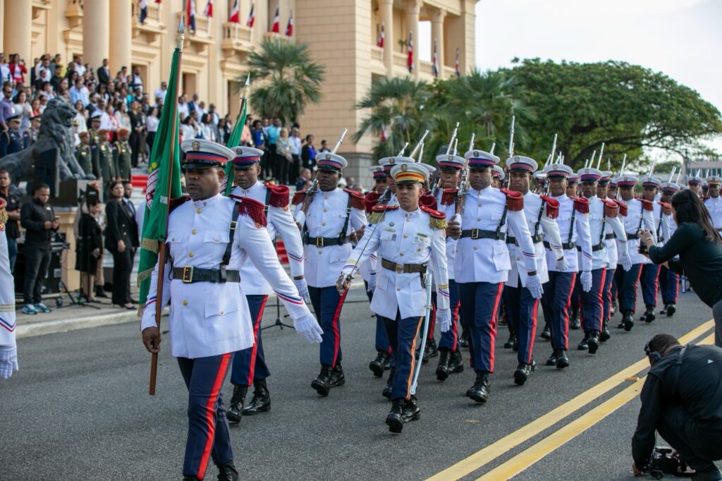 Luego, se llevó a cabo la rendición de honores militares de estilo al presidente Abinader, autoridad suprema de las Fuerzas Armadas y la Policía Nacional, que consistieron en toque de atención presidencial, presenten armas, una salva de 21 disparos de artillería y la entonación del himno nacional a cargo del Primer Regimiento de la Guardia Presidencial.