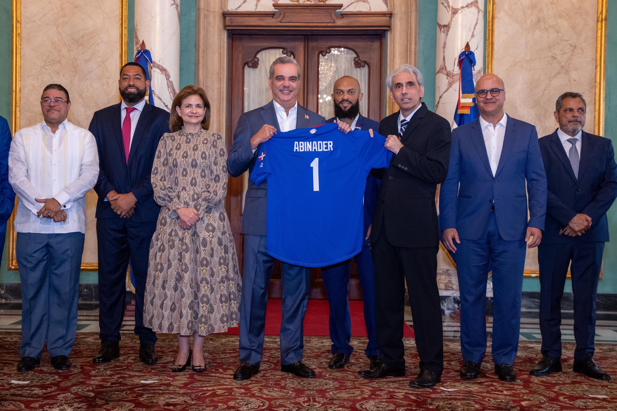 De igual forma, el mandatario recibió la camiseta que usará el conjunto dominicano en el torneo con el número 1 y el apellido Abinader y la vicepresidenta con el número 2 y el apellido Peña.