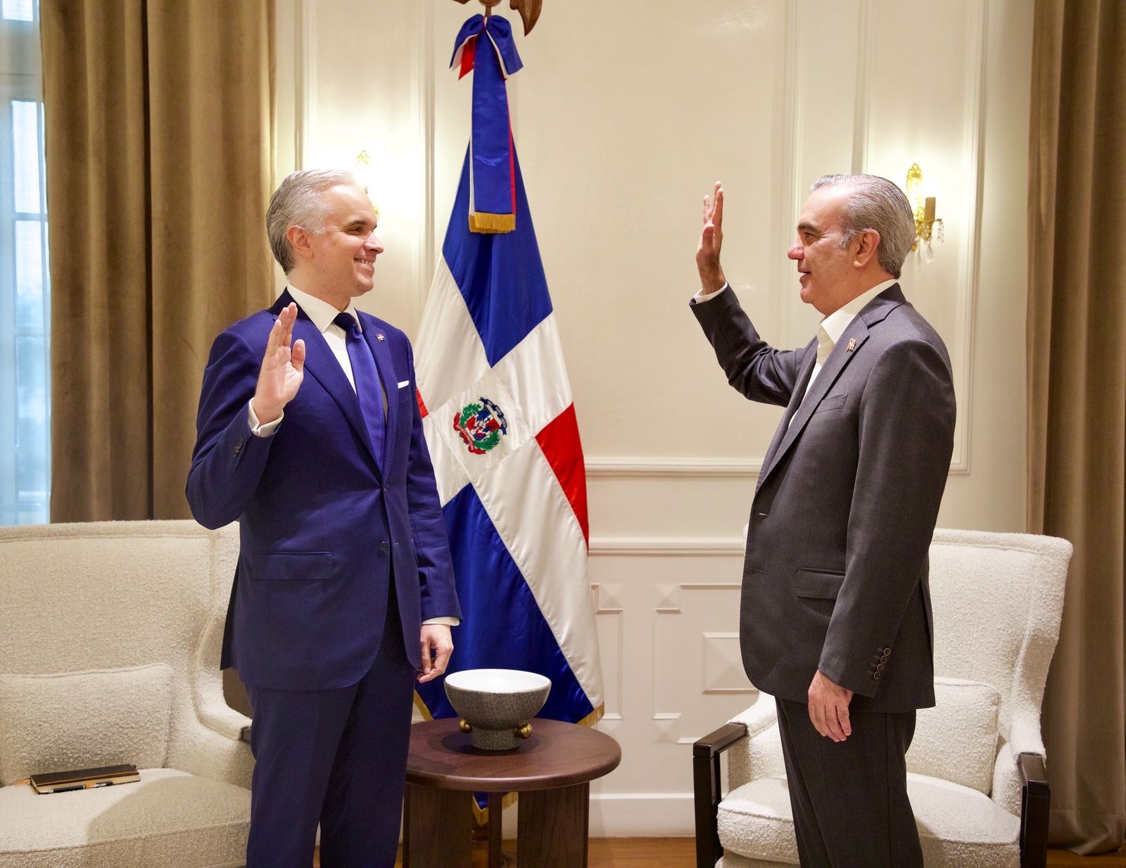 Santo Domingo. – El presidente Luis Abinader juramentó este miércoles en el Palacio Nacional a Eduardo Estrella como nuevo ministro de Obras Públicas y Comunicaciones y a Luis Miguel De Camps como ministro de Educación.