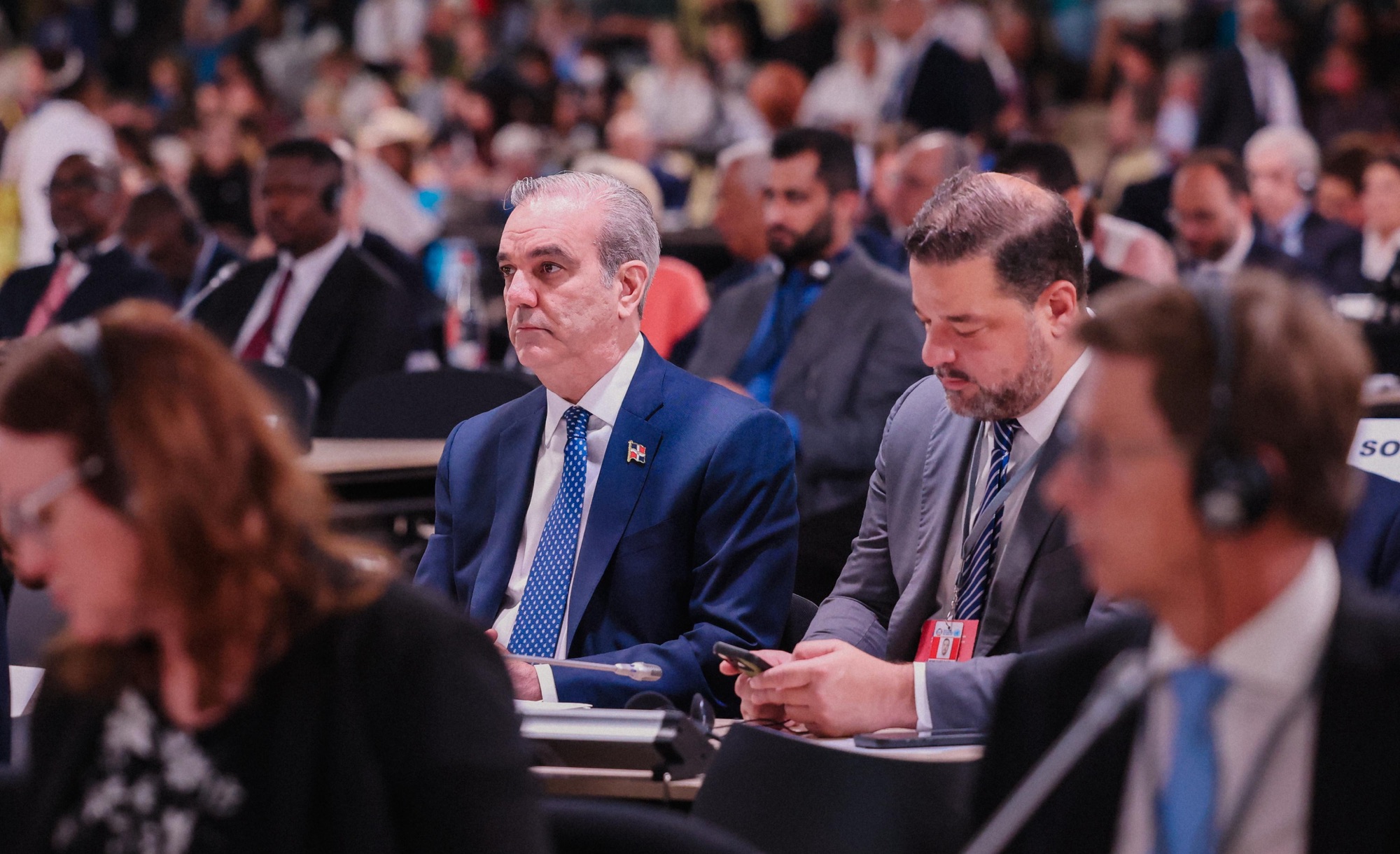El presidente Abinader asiste a las sesiones plenarias junto al ministro de Medio Ambiente, Miguel Ceara Hatton; el vicepresidente ejecutivo del Consejo Nacional para el Cambio Climático, Max Puig; y el presidente de la Autoridad Nacional de Asuntos Marítimos, Jimmy García Saviñón.