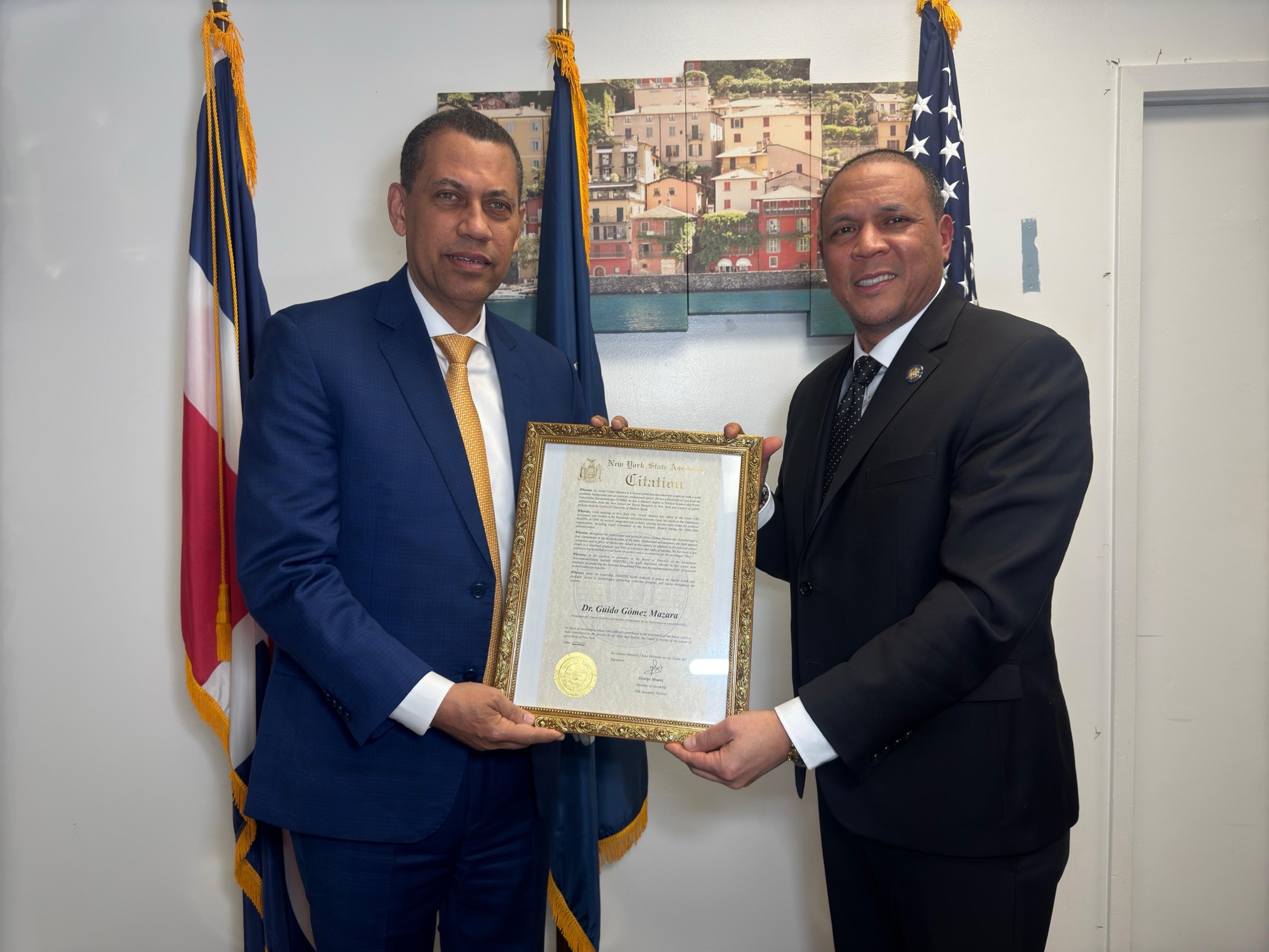 Guido Gómez Mazara recibió la distinción por parte del asambleísta de Nueva York, George Álvarez, por su compromiso con el desarrollo digital