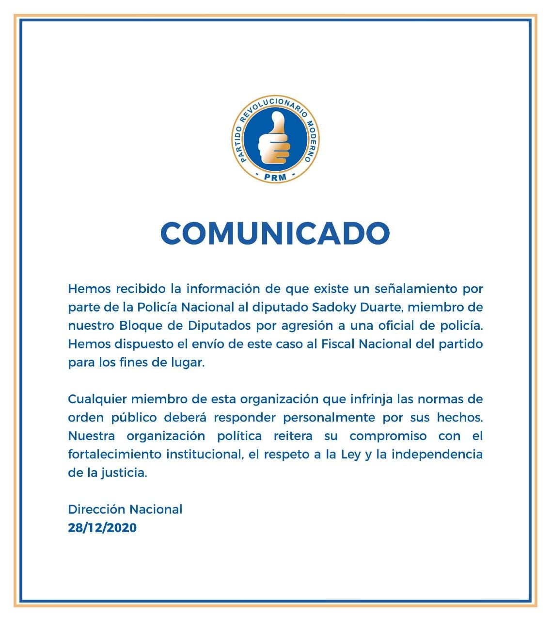 Hemos recibido la información de que existe un señalamiento por parte de la Policía Nacional al diputado Sadoky Duarte, miembro de nuestro Bloque de Diputados por agresión a una oficial de policía. Hemos dispuesto el envío de este caso al Fiscal Nacional del partido para los fines de lugar.
