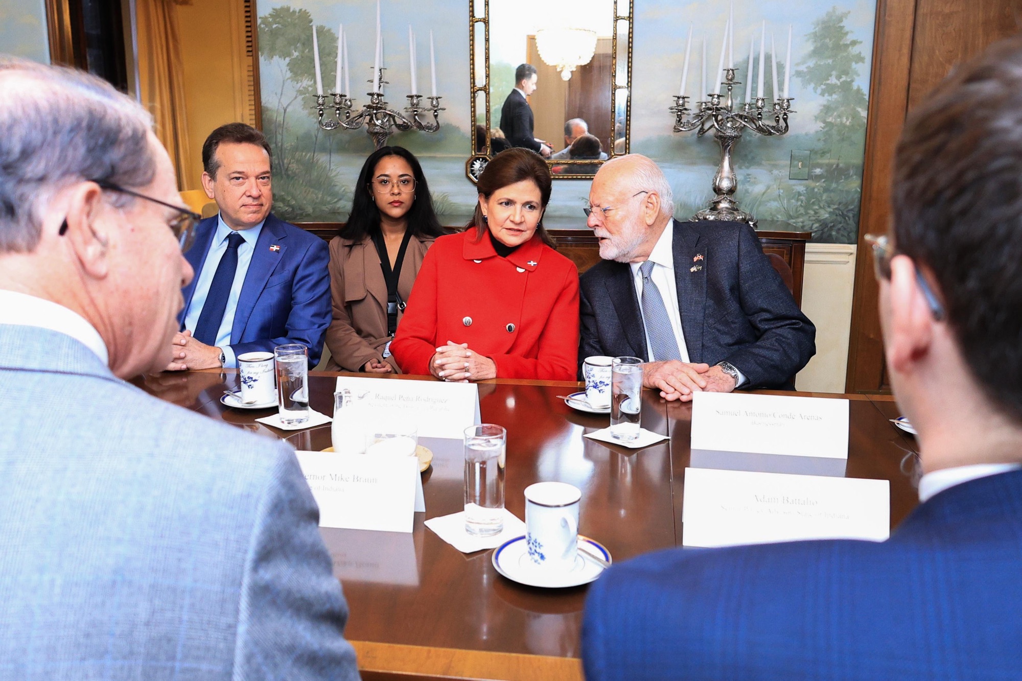 La vicepresidenta Raquel Peña estuvo acompañada del ministro del Ministerio de Industria, Comercio y Mipymes (MICM); Víctor Bisonó; la embajadora en misión especial ante la Vicepresidencia en temas de inversión y sostenibilidad, María Eugenia del Castillo; así como por los señores Samuel Conde, Felipe Herrera, Carlos Flaquer y Marino Auffant.