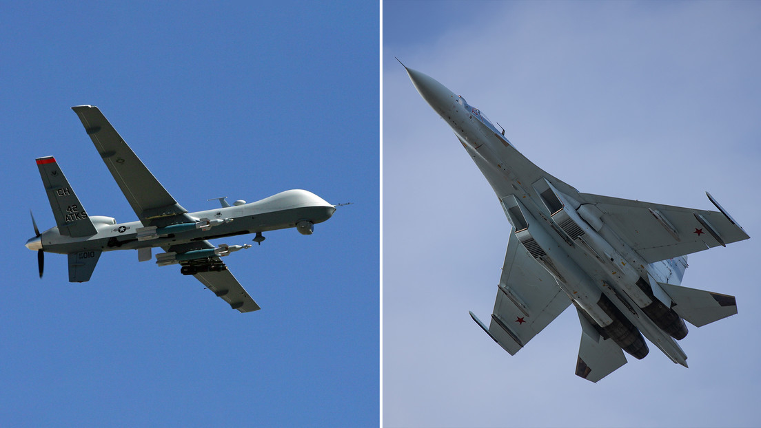 Un dron MQ-9 Reaper y un caza Su-27.Vitaly Timkiv / Gettyimages.ru / Ethan Miller / Sputnik