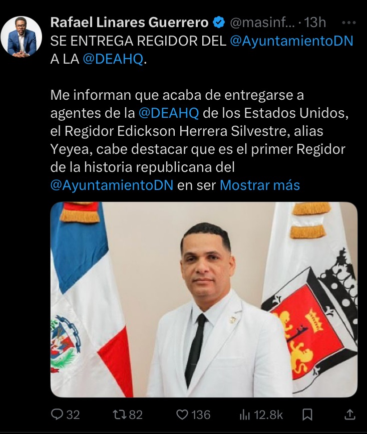 Santo Domingo. – El regidor del Distrito Nacional, Edickson Herrera Silvestre, conocido popularmente como “Yeyea”, se entregó voluntariamente a la Administración de Control de Drogas de los Estados Unidos (DEA), según confirmó el abogado y analista Rafael Linares a través de una publicación en su cuenta oficial de X (antes Twitter).