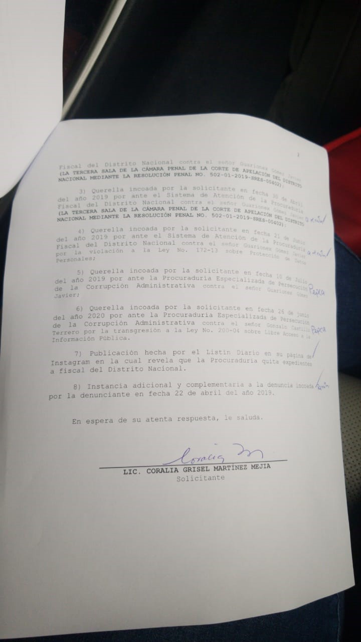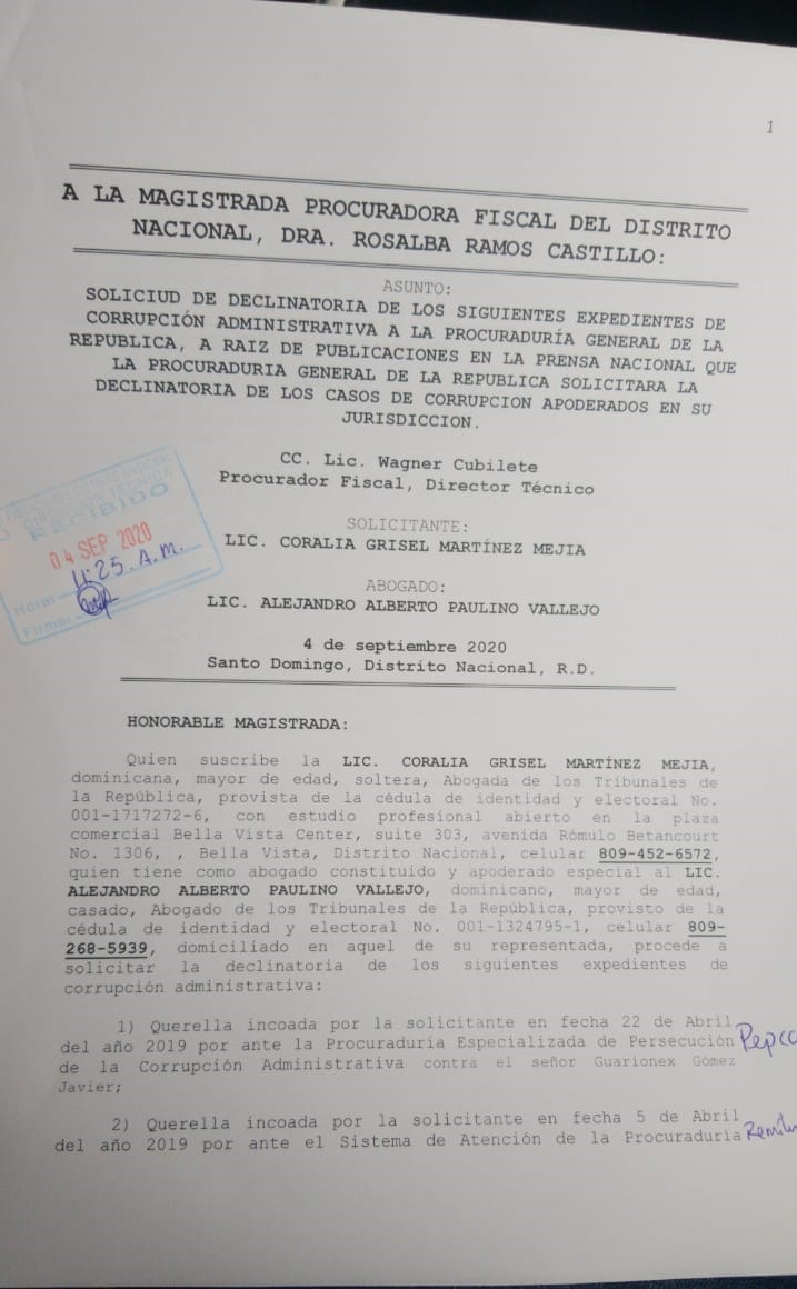 La abogada Coralia Martínez Vallejo solicitó mediante comunicación formal a la Procuraduría Fiscal del Distrito Nacional que seis querellas de corrupción depositadas cotra Gonzalo Castillo, exministro de Obras Públicas, sean remitidas a la Procuraduría General de la República, para que la procuradora Miriam Germán Brito pueda darles curso.