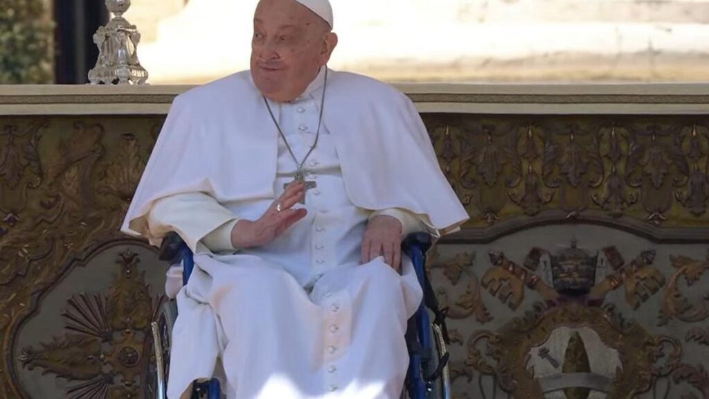 El papa Francisco, convaleciente tras su larga hospitalización por una doble neumonía, apareció por sorpresa este domingo en la plaza de San Pedro del Vaticano para saludar y bendecir a los fieles.