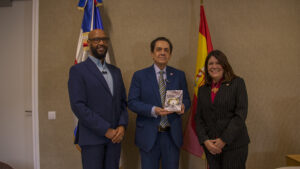 Madrid, España — En un ambiente de calidez, reflexión y reconocimiento, el embajador de la República Dominicana en el Reino de España, Tony Raful, recibió en la sede diplomática al psicólogo, abogado y escritor dominicano Juan Rojas, autor del libro “Cuando la Vida nos Sacude”, quien hizo entregó al diplomático la obra.