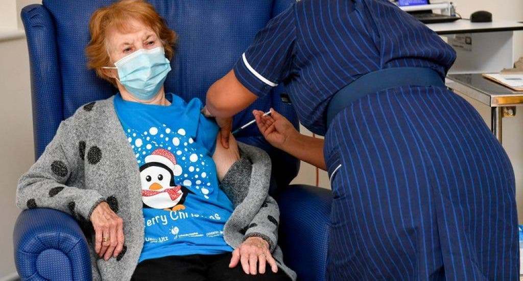 Una mujer de 90 ha sido la primera persona en el Reino Unido y el mundo en recibir la vacuna contra la covid-19 desarrollada por la farmacéutica estadounidense Pfizer y su socio alemán BioNTech, informaron este martes los medios.