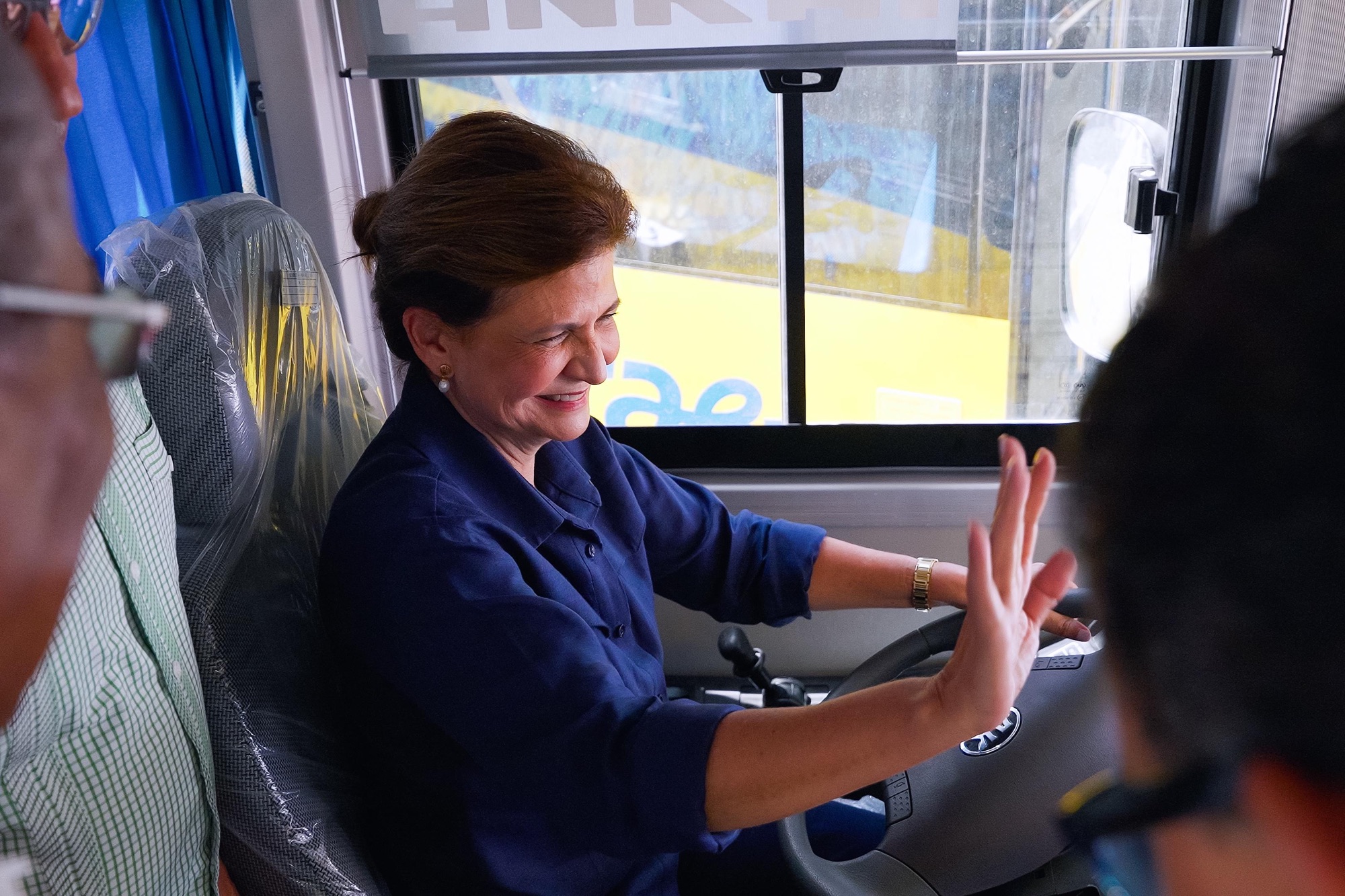Santiago, RD. – Desde uno de los 150 autobuses escolares que se entregaron formalmente este domingo en Santiago, la vicepresidenta de la República, Raquel Peña, dejó en funcionamiento el Sistema Nacional de Transporte Estudiantil (TRAE) para Santiago.