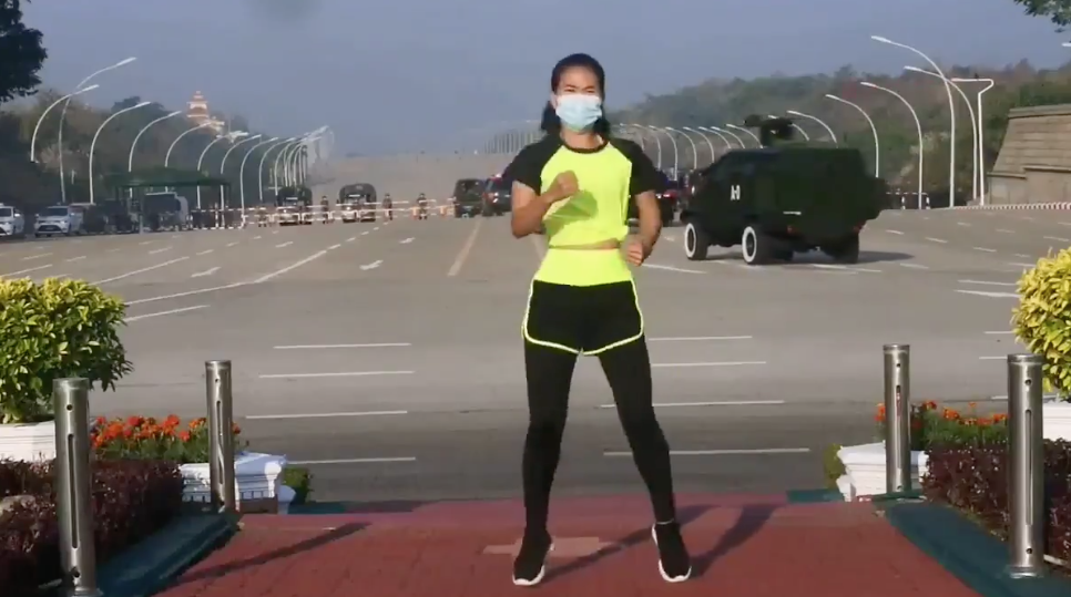 Una chica que emite clases de aeróbics en línea en Birmania se viralizó este lunes en las redes sociales luego de que en ese país se fraguara un golpe de Estado que ya fue reprobado por la comunidad internacional: la chica realiza sus rutinas al aire libre, con cubrebocas, ropa deportiva y música de fondo, y la crisis política fue de poca importancia ante su emisión mañanera. Aunque, todo a punta, que por desarrollarse el movimiento a sus espaldas, ni se dio cuenta.